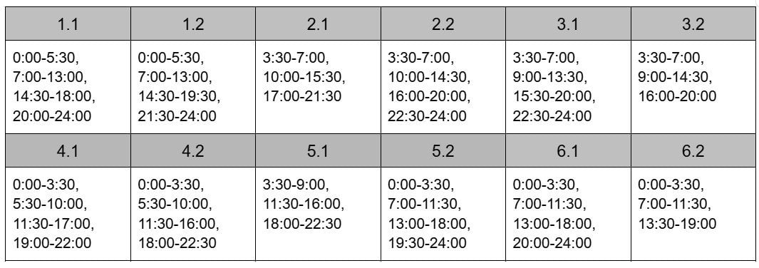 6.2: 00:00 — 03:30, 07:30 — 12:30, 16:30 — 21:30