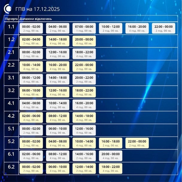 ДТЕК анонсував графіки погодинних відключень світла на середу, 17 грудня, для столиці та всіх регіонів України.