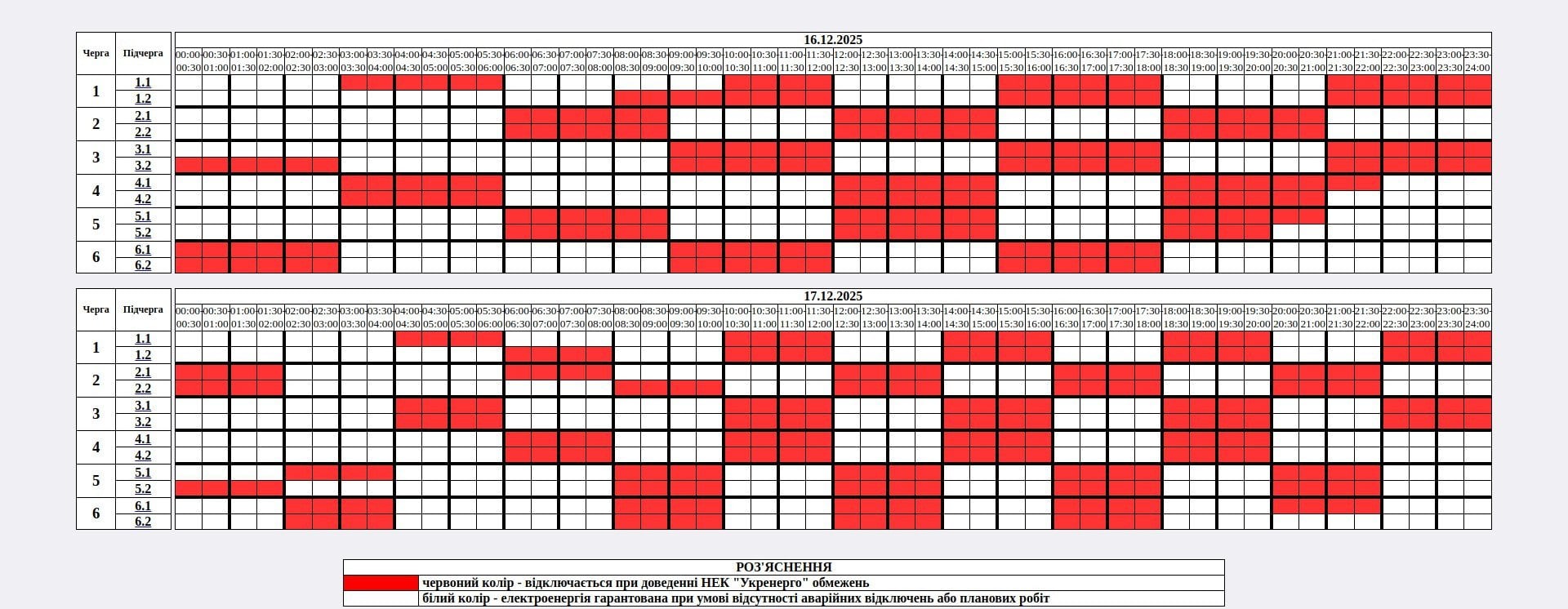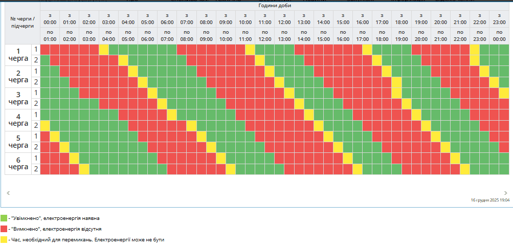 У більшості регіонів Україні у середу, 17 грудня діятимуть графіки погодинних відключень світла. Причина запровадження обмежень — наслідки попередніх російських масованих ракетно-дронових атак на енергооб’єкти.