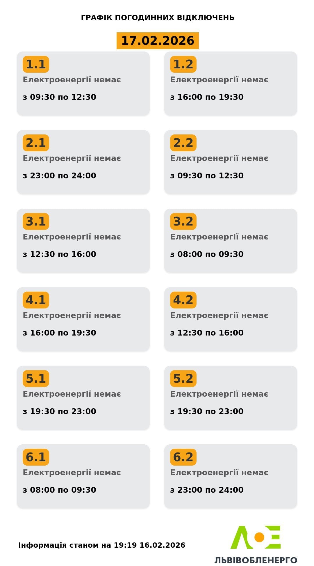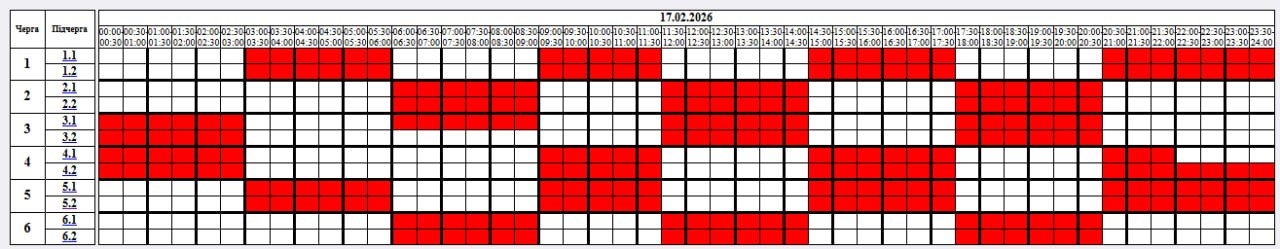 У вівторок, 17 лютого, застосують наступні графіки відключення: