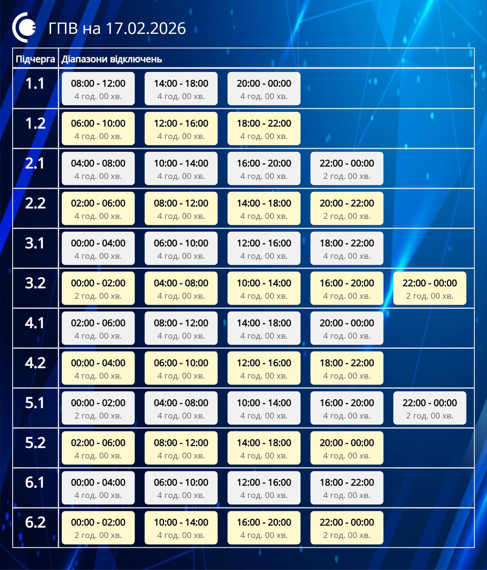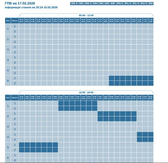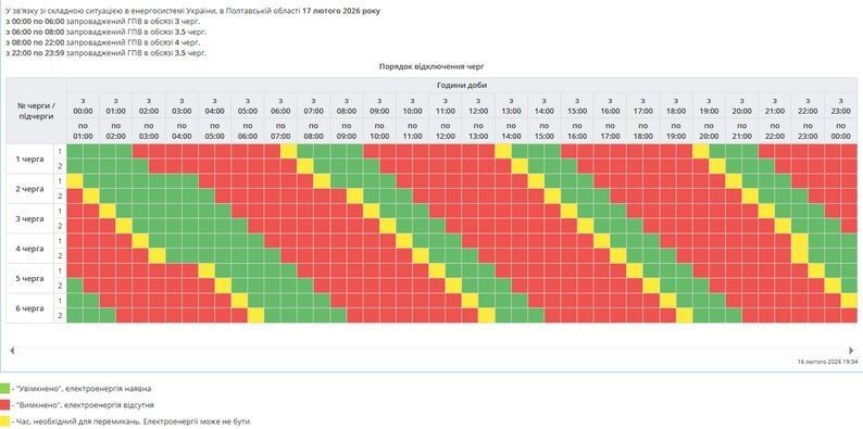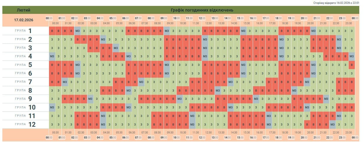 За розпорядженням НЕК «Укренерго» 17.02.2026 буде діяти наступний графік погодинних відключень (ГПВ):