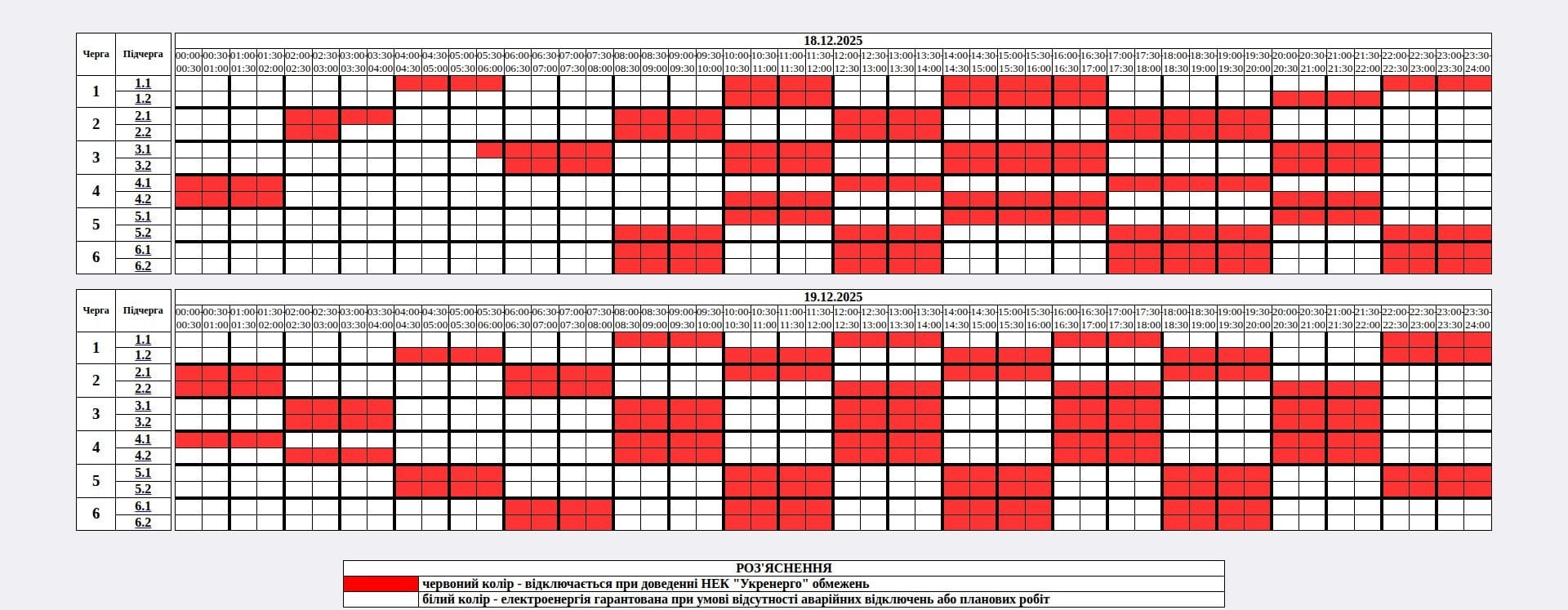 У Києві 19 грудня діятимуть посилені графіки стабілізаційних відключень: для деяких черг (зокрема 4.2) сумарна тривалість відсутності світла сягатиме 11 годин на добу. Споживачів відключатимуть двічі або тричі на день, а тривалість одного слоту становитиме від 3 до 7 годин.