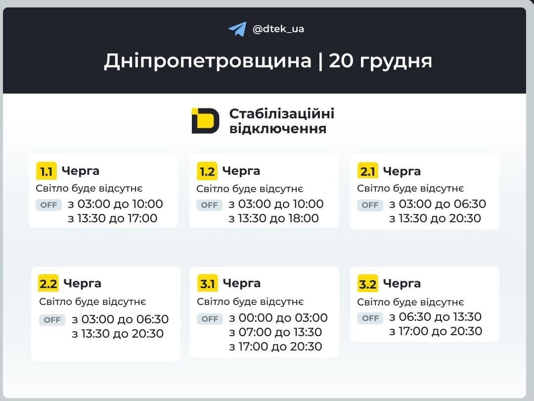 Графік відключення світла на Дніпропетровщині 20 грудня / © ДТЕК