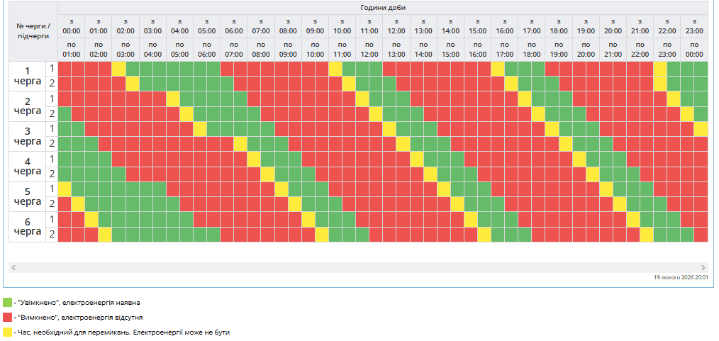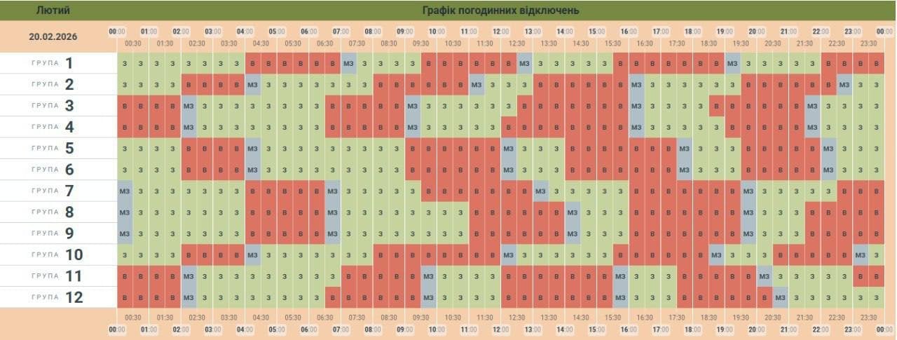 У більшості регіонів України у п’ятницю, 20 лютого, будуть запроваджені графіки погодинних відключень світла. Причина обмежень електропостачання — наслідки російських масованих ракетно-дронових атак на енергооб’єкти.