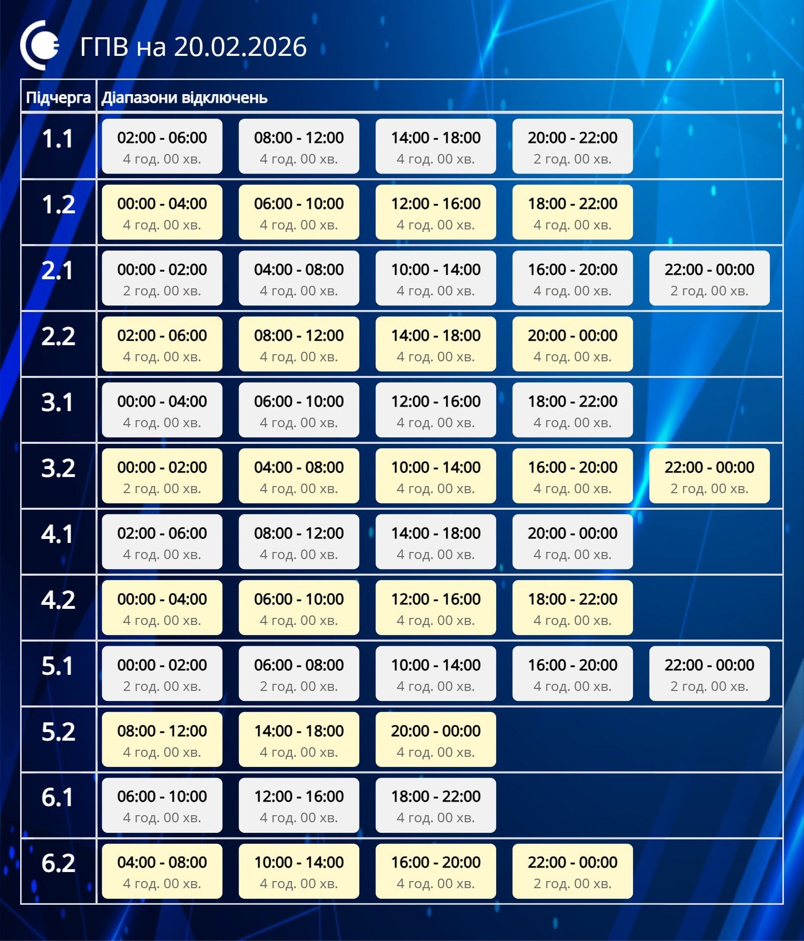 Черга 6.1: 0:00-4:00, 8:00-12:00, 16:00-22:00