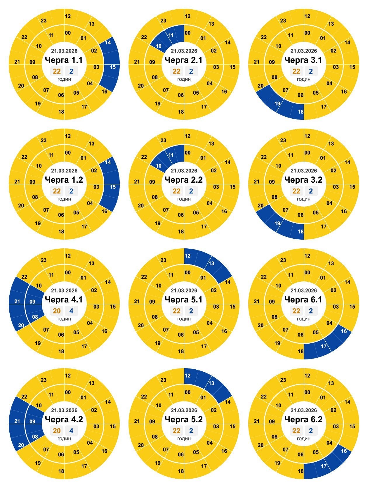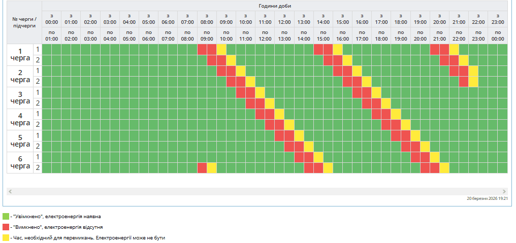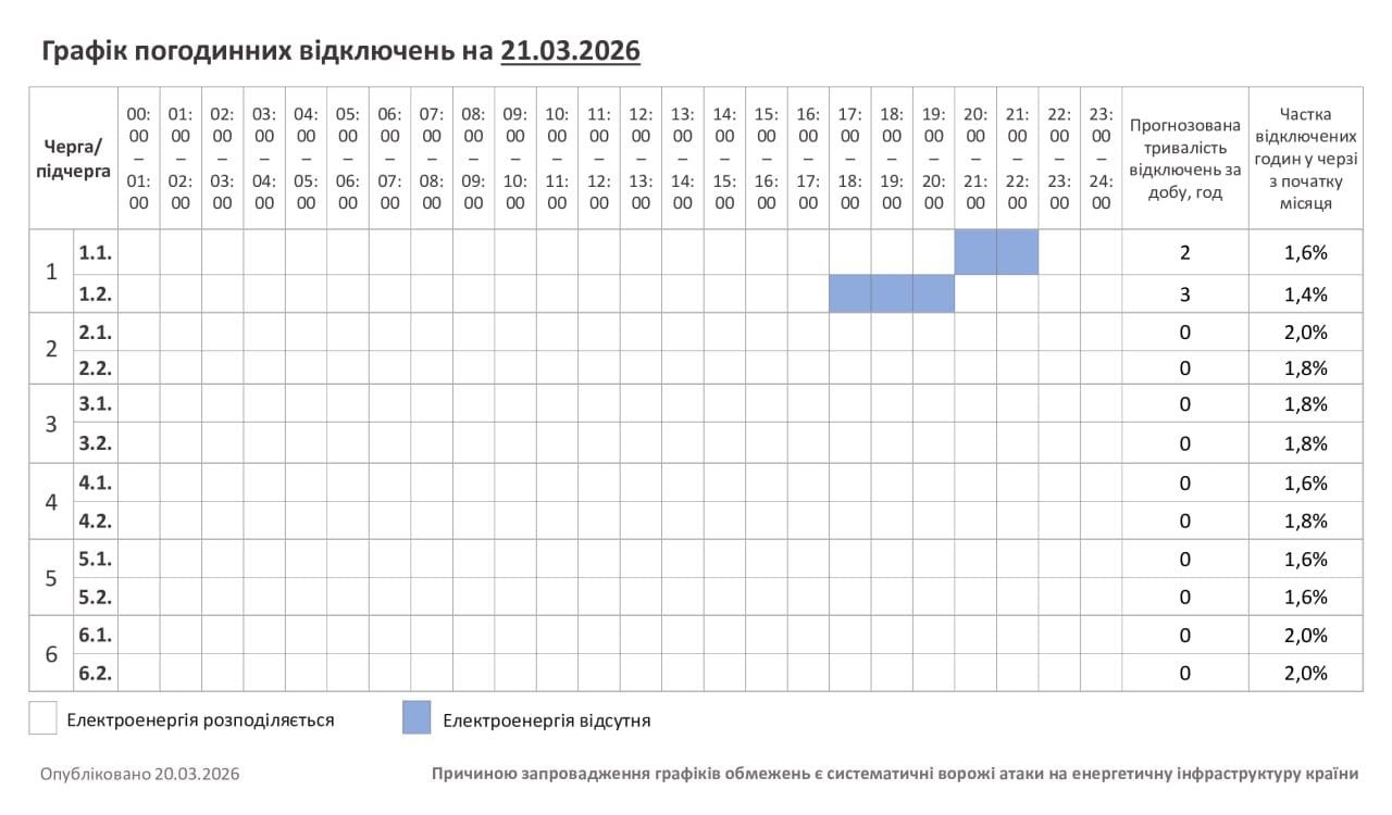В усіх регіонах Україні у суботу, 21 березня, будуть запроваджені графіки погодинних відключень світла. Причина обмежень електропостачання — наслідки російських масованих ракетно-дронових атак на енергооб’єкти.