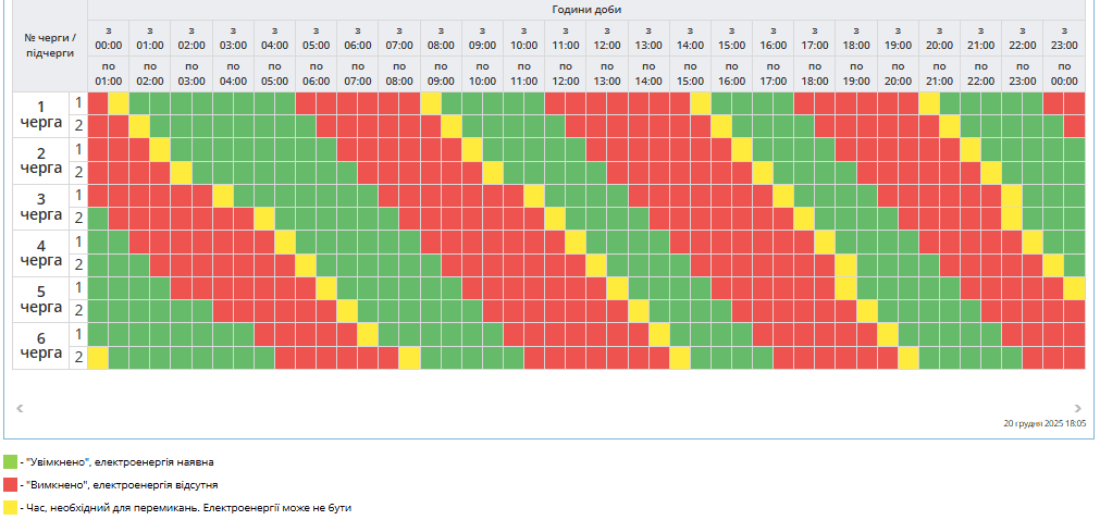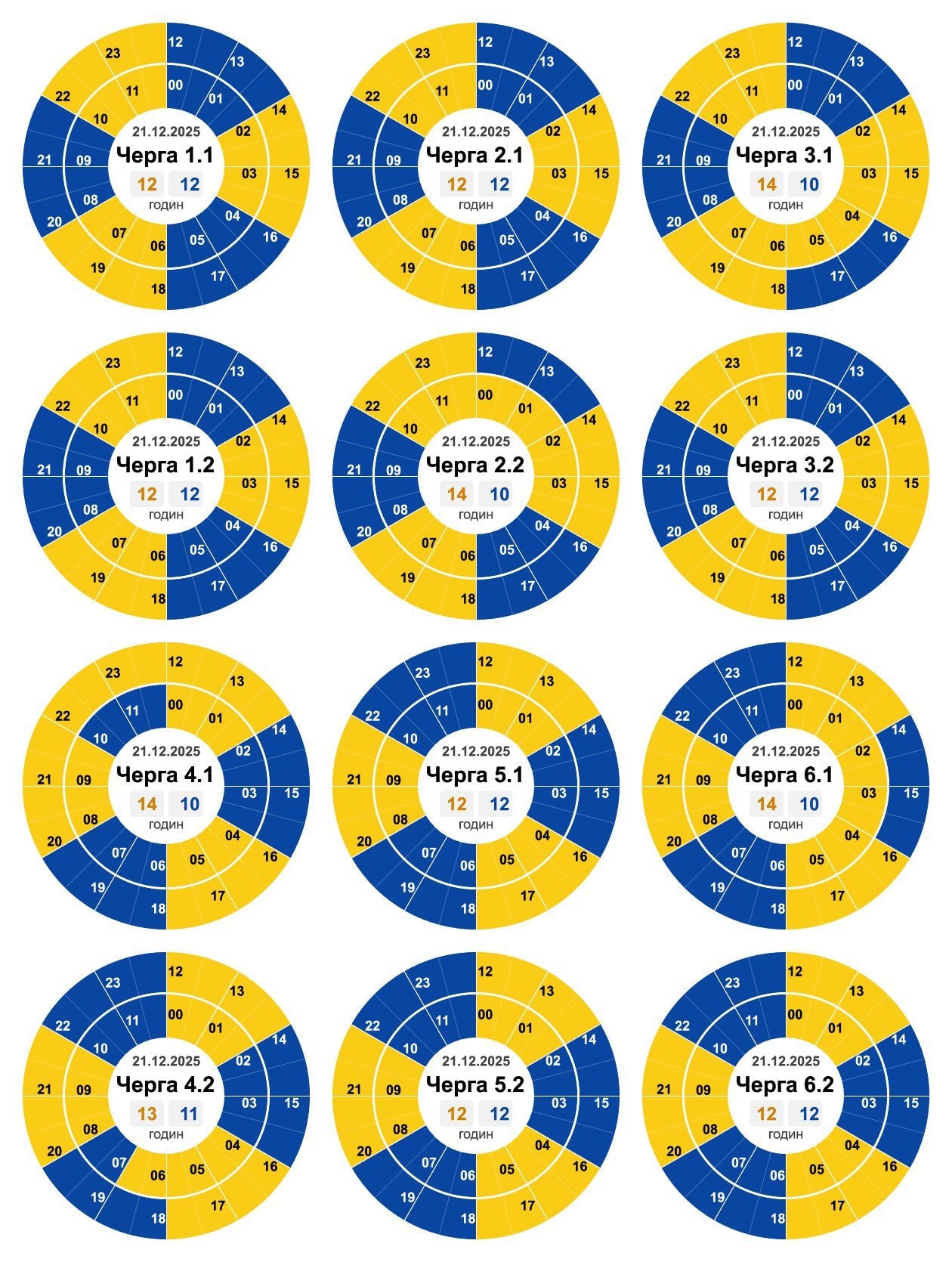 На Житомирщині 21 грудня графік дуже суворий, але стабільний: світла не буде рівно половину доби — 12 годин сумарно для всіх черг. Діє чітка схема «4 через 4», де чотиригодинні відключення постійно змінюються такими ж за тривалістю періодами зі світлом.