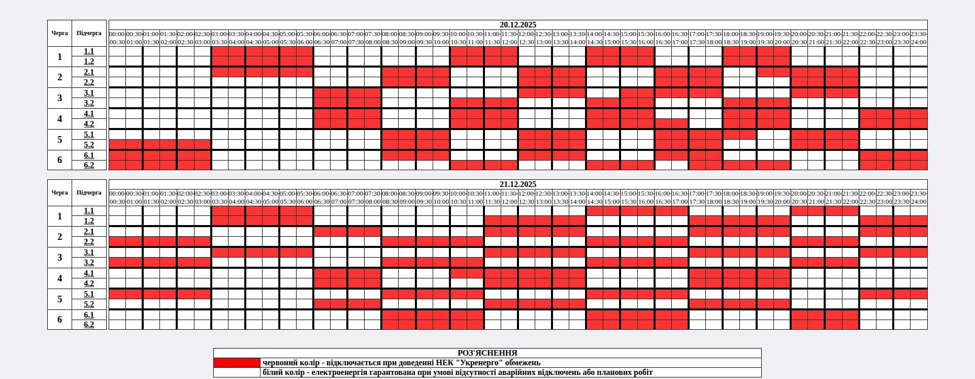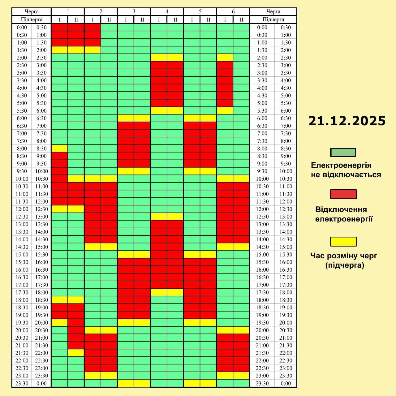 У Черкаській області 21 грудня графіки передбачають відключення сумарною тривалістю 9–10 годин на добу для кожної черги. Світло вимикатимуть у 3–5 часових проміжків, що рівномірно розподілені протягом усієї доби.