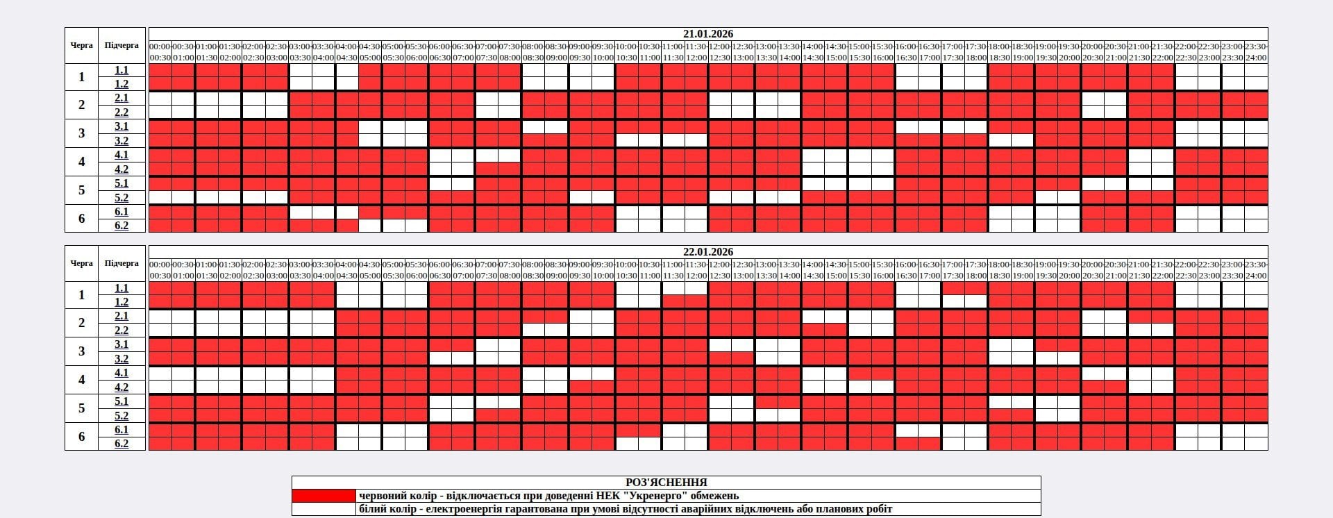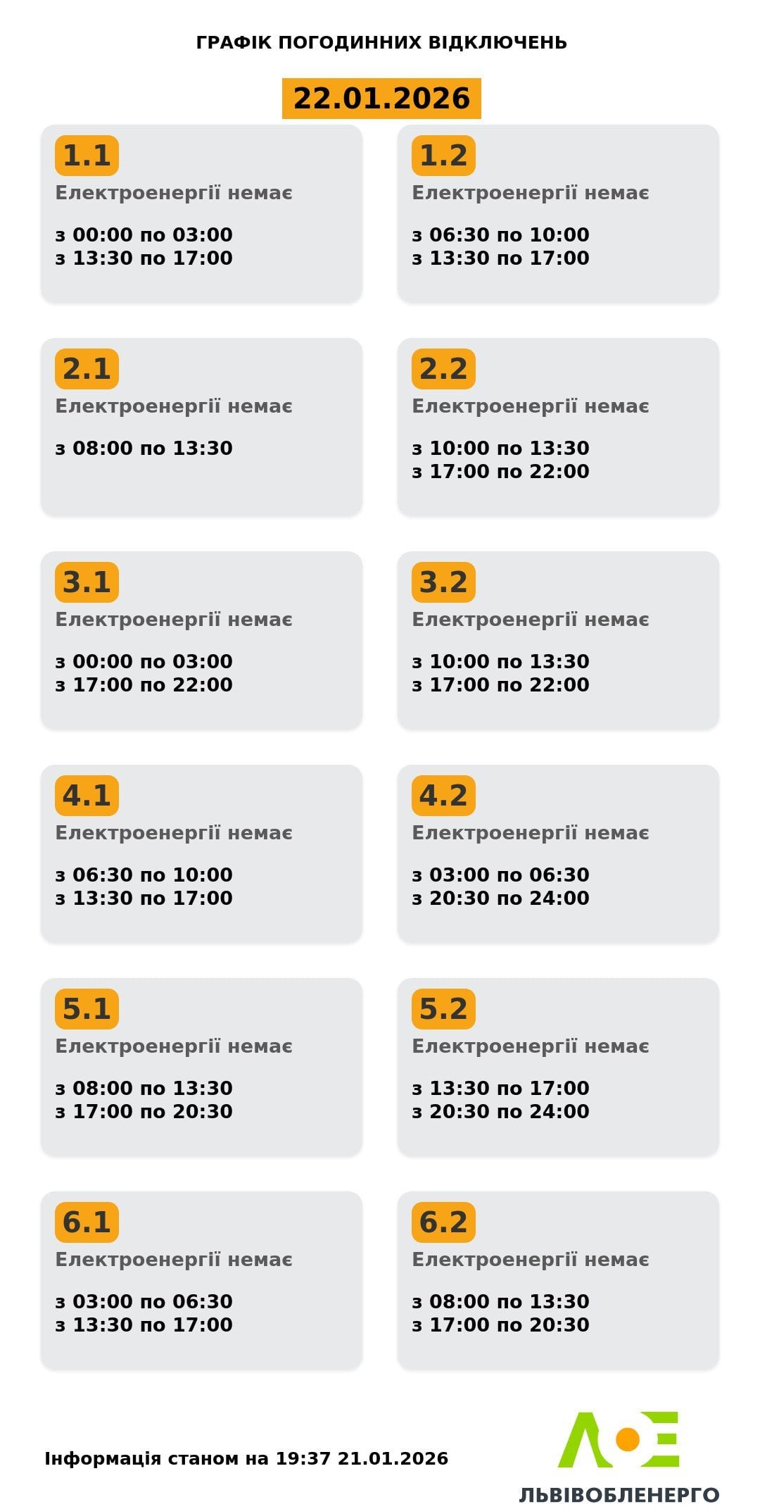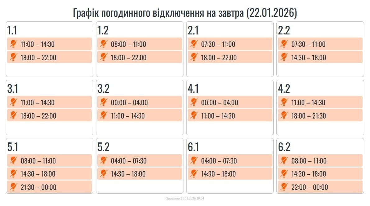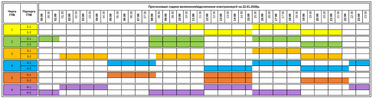 В усіх регіонах Україні у четвер, 22 січня, будуть запроваджені графіки погодинних відключень світла. Причина обмежень електропостачання — наслідки російських масованих ракетно-дронових атак на енергооб’єкти.