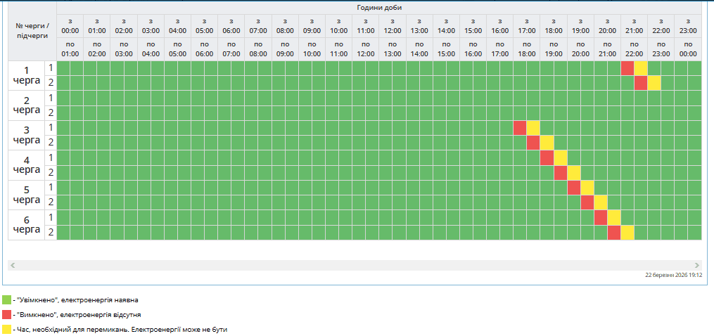 В усіх регіонах Україні у понеділок, 23 березня, будуть запроваджені графіки погодинних відключень світла. Причина обмежень електропостачання — наслідки російських масованих ракетно-дронових атак на енергооб’єкти.