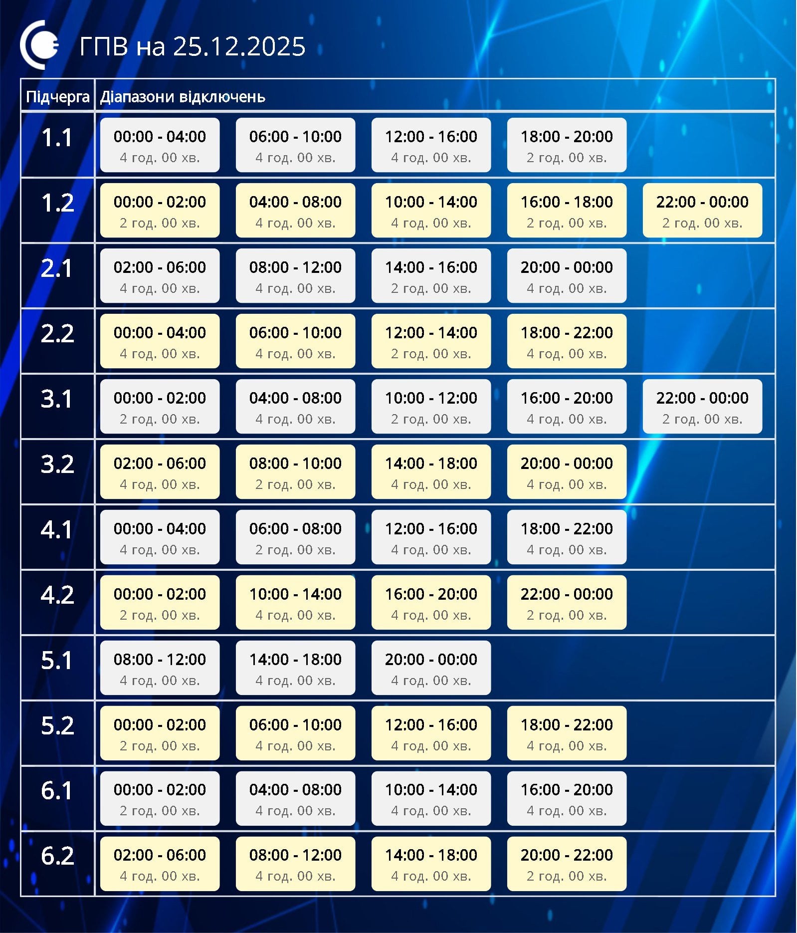 На Закарпатті 25 грудня графік буде одним із найкомфортніших по країні: світло вимикатимуть лише один раз на добу. Тривалість цього єдиного відключення складає переважно 4 години (для черг 1, 2, 3), а деякі групи (4 та 5.1) матимуть ще коротші обмеження — по 1,5–2 години, тож сумарно електроенергія буде наявна понад 20 годин.