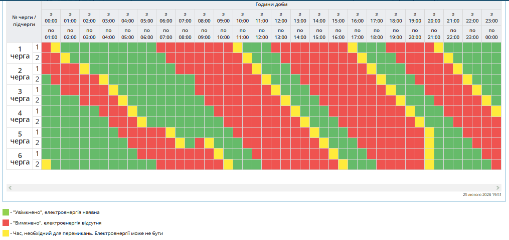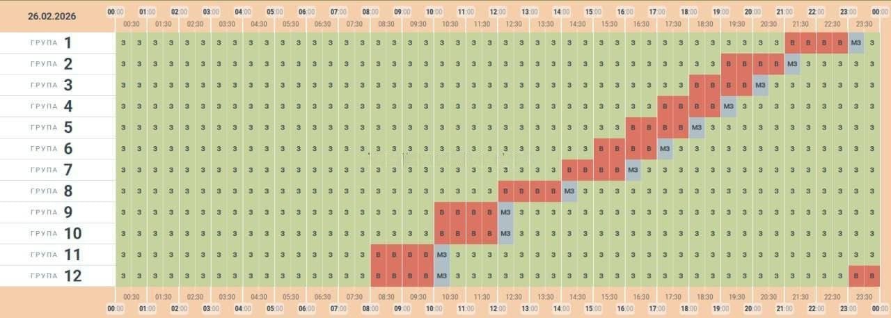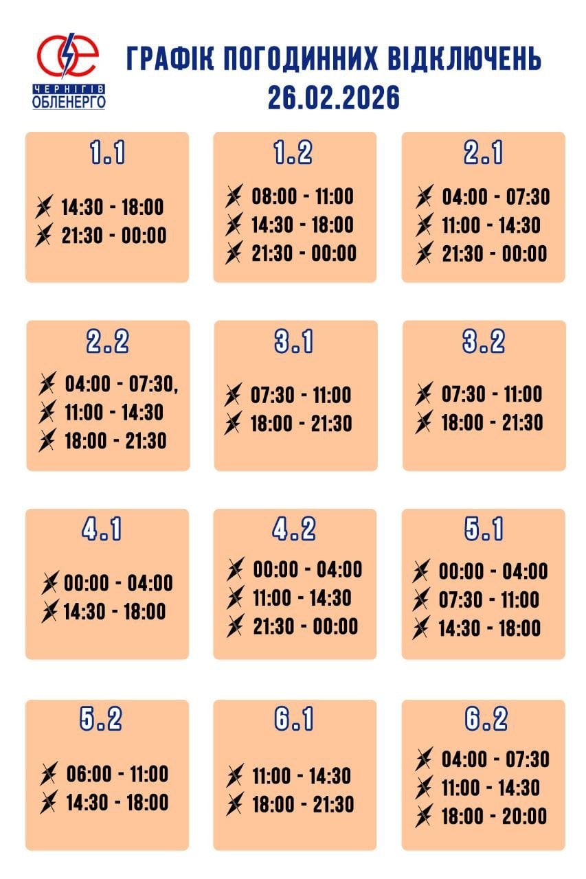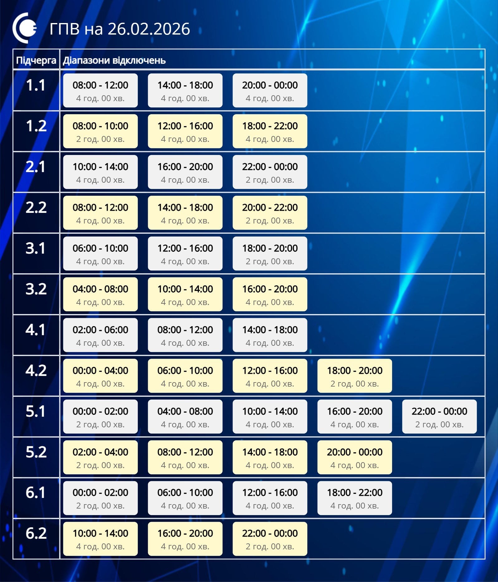 В усіх регіонах Україні у четвер, 26 лютого, будуть запроваджені графіки погодинних відключень світла. Причина обмежень електропостачання — наслідки російських масованих ракетно-дронових атак на енергооб’єкти.