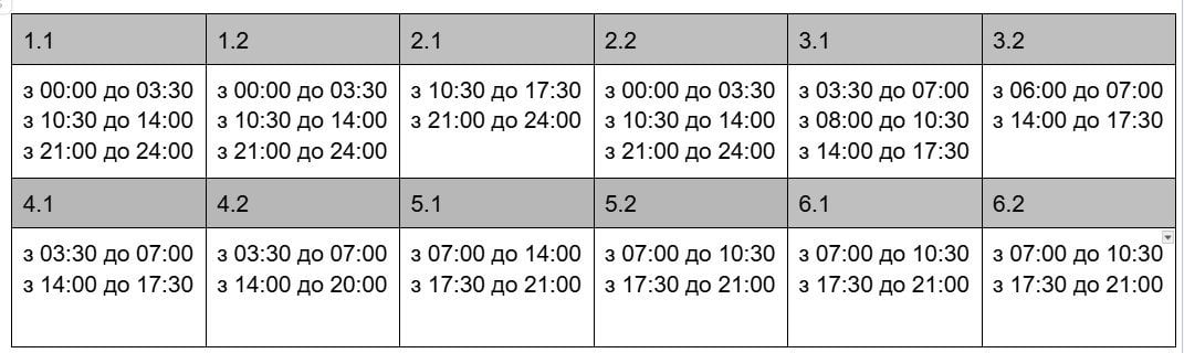 Черга 1.2: 00-02, 08-10, 12-14, 16-18, 20-22