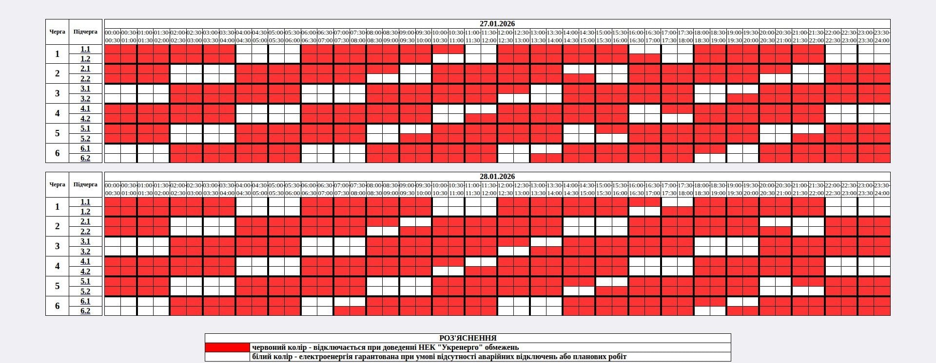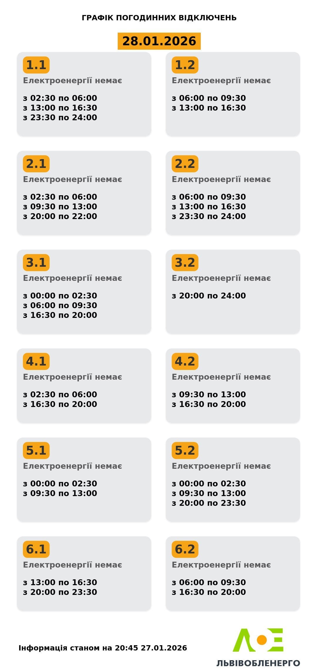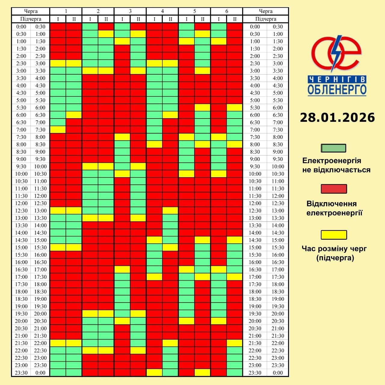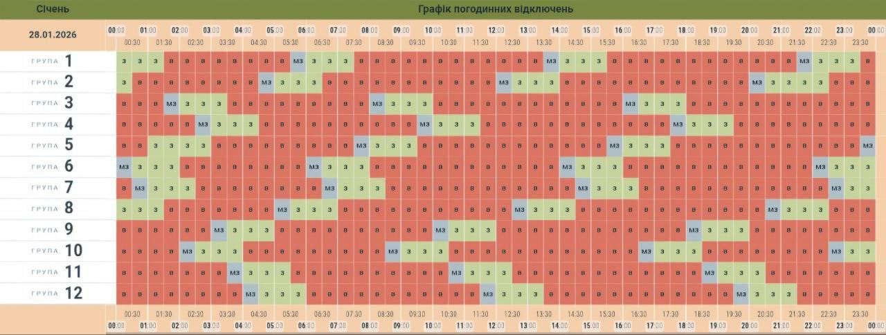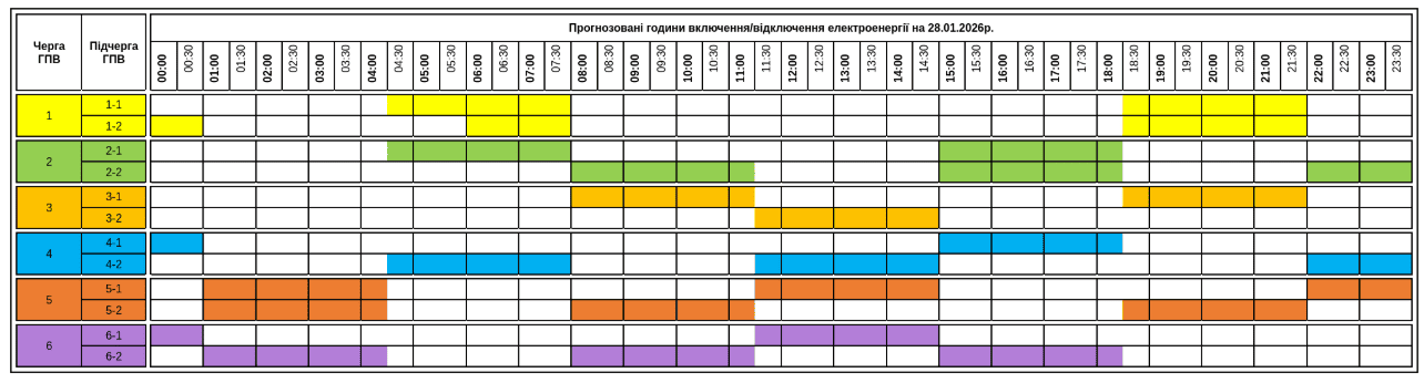 В усіх регіонах Україні у середу, 28 січня, будуть запроваджені графіки погодинних відключень світла. Причина обмежень електропостачання — наслідки російських масованих ракетно-дронових атак на енергооб’єкти.