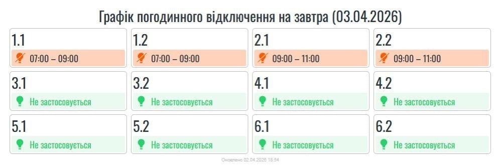 В усіх регіонах Україні у п’ятницю, 3 квітня, будуть запроваджені графіки погодинних відключень світла. Причина обмежень електропостачання — наслідки російських масованих ракетно-дронових атак на енергооб’єкти.