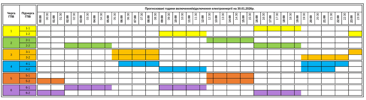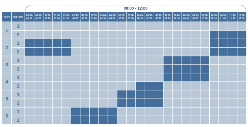 Черга 2.1: 00:00-01:30; 04:00-11:30; 13:30-20:30; 22:30-24:00