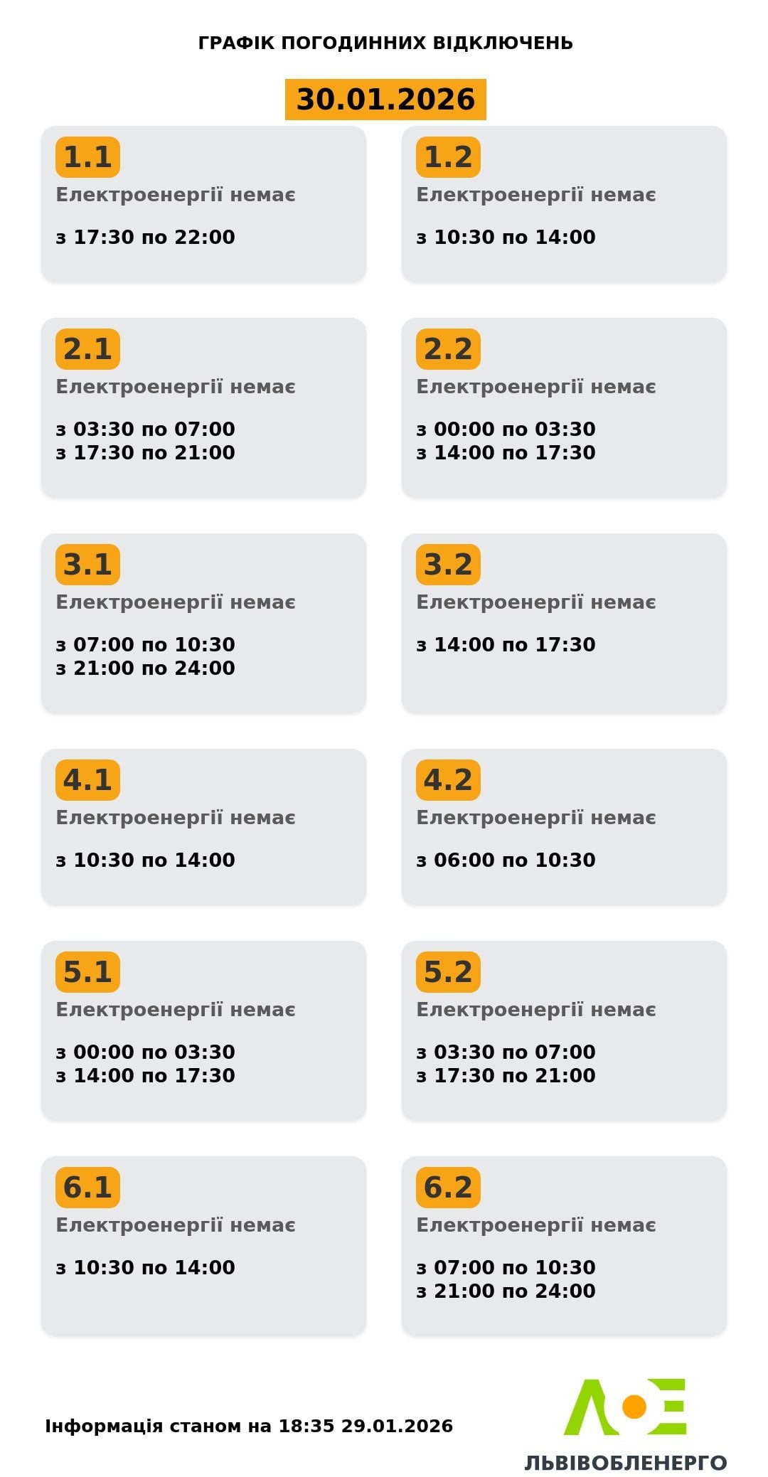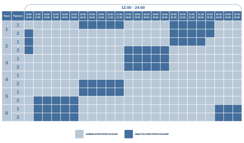 Години відсутності електропостачання по чергам (підчергам) вказані з урахуванням 30 хвилин на перемикання. Дізнатися номер своєї черги за адресою можна на сайті обленерго