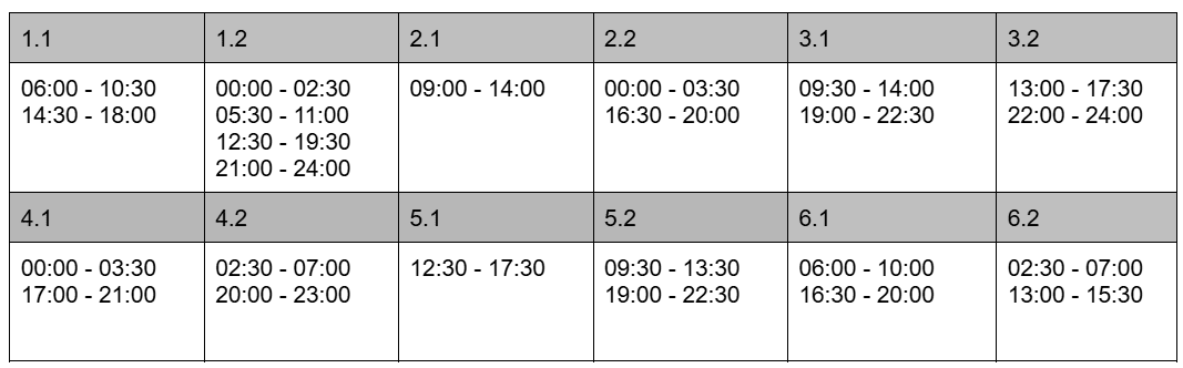 1.1 00:00 — 04:00, 06:00 — 10:30, 12:00 — 16:30, 18:00 — 22:00