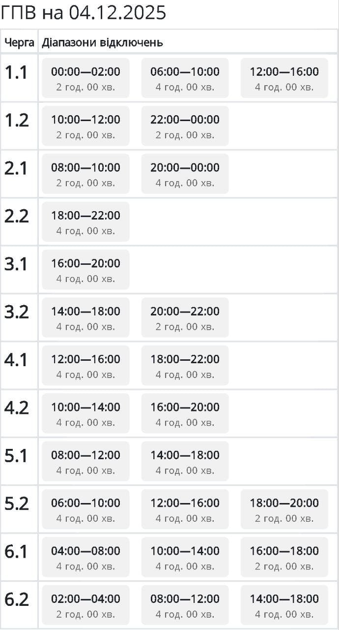 Відключення світла 4 грудня: актуальні графіки для Києва та всіх областей