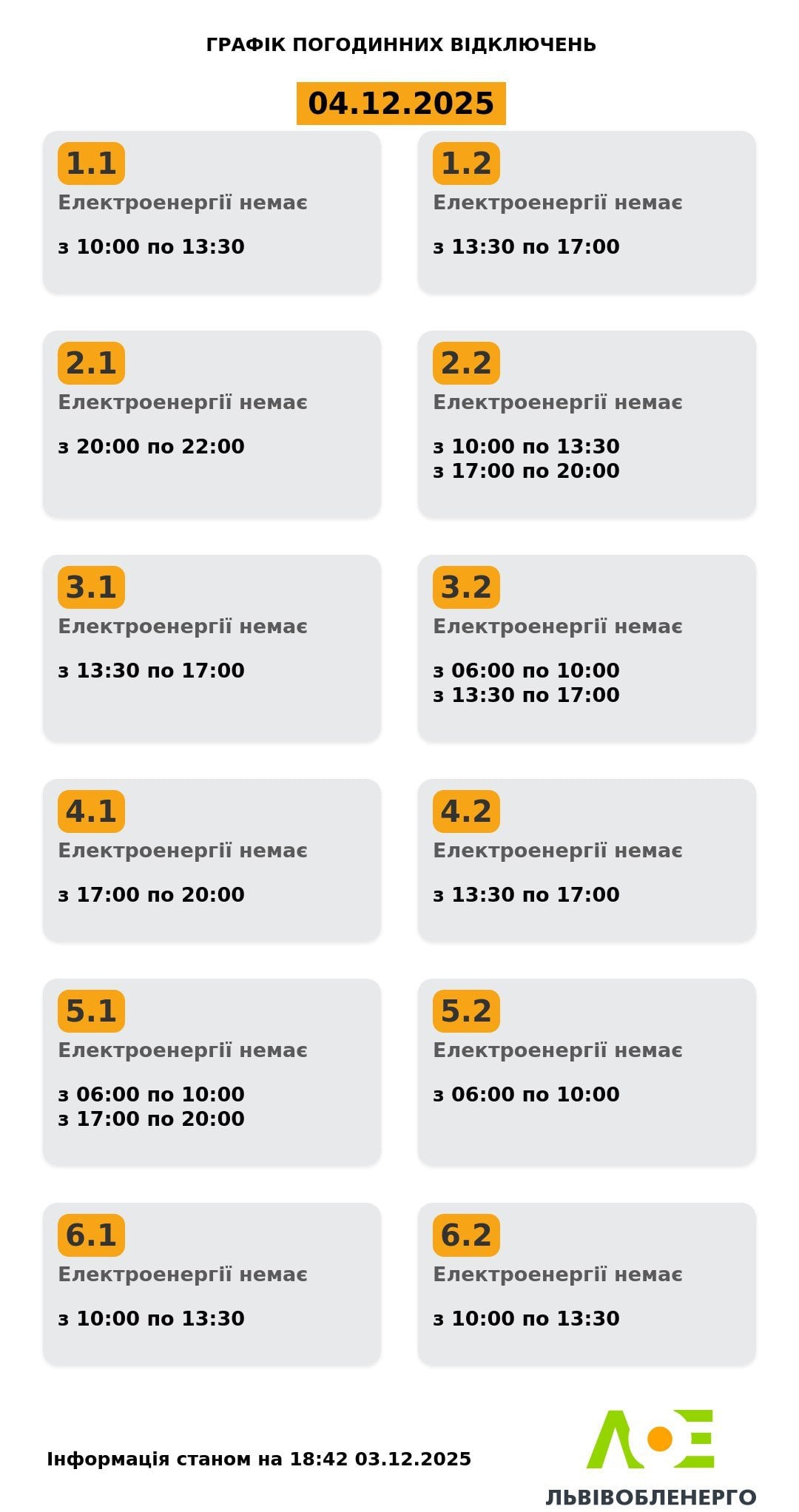 Графік відключення світла на Львівщині 4 грудня