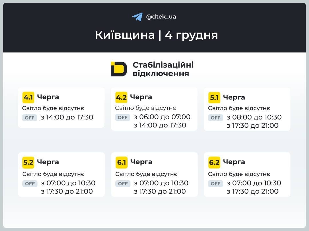 Графік відключення світла на Київщині 4 грудня / © ДТЕК