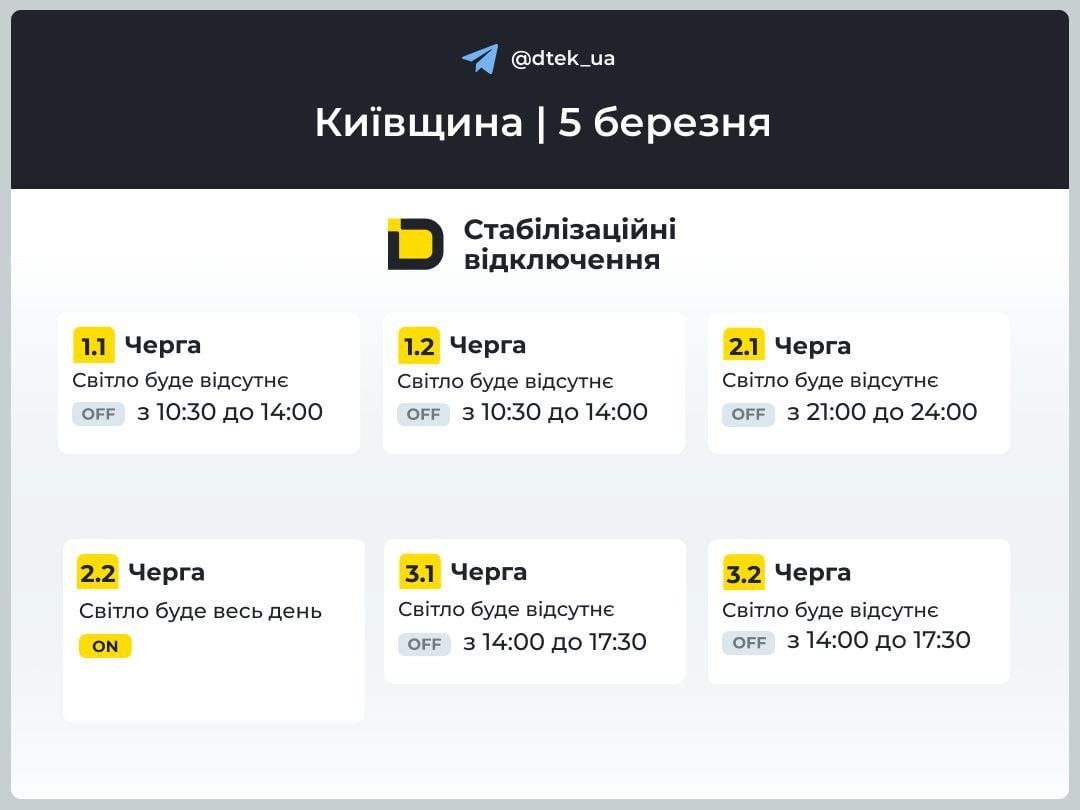 Графік відключення світла на Київщині 5 березня / © ДТЕК