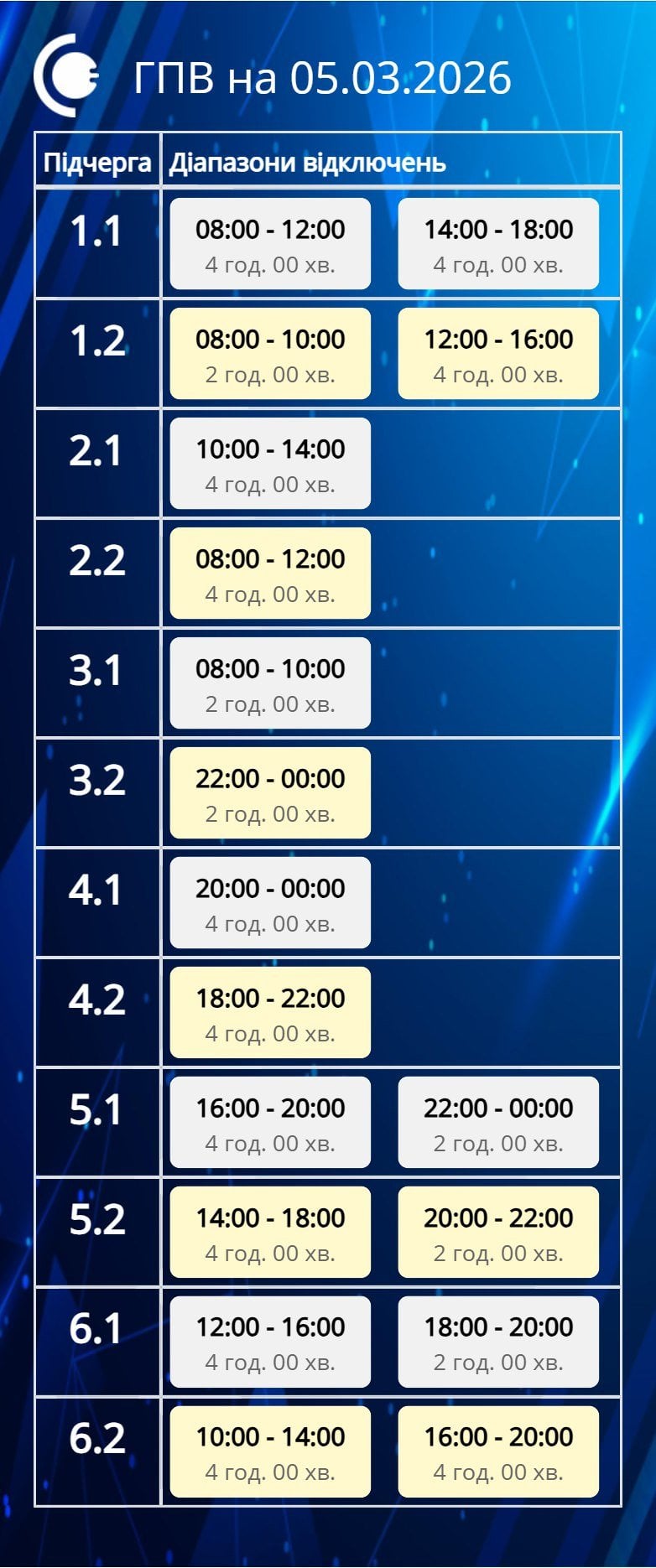 Графік відключення світла на Чернігівщині 5 березня