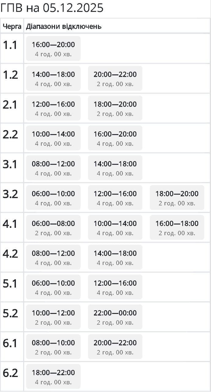 Відключення світла 5 грудня: актуальні графіки для Києва та всіх областей