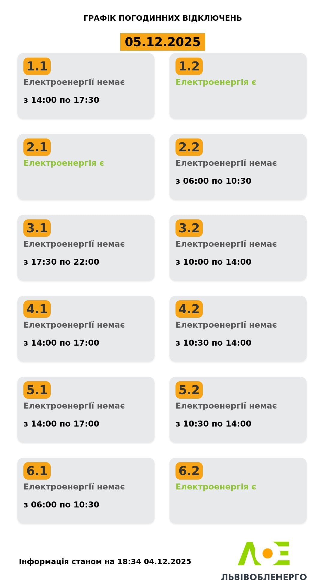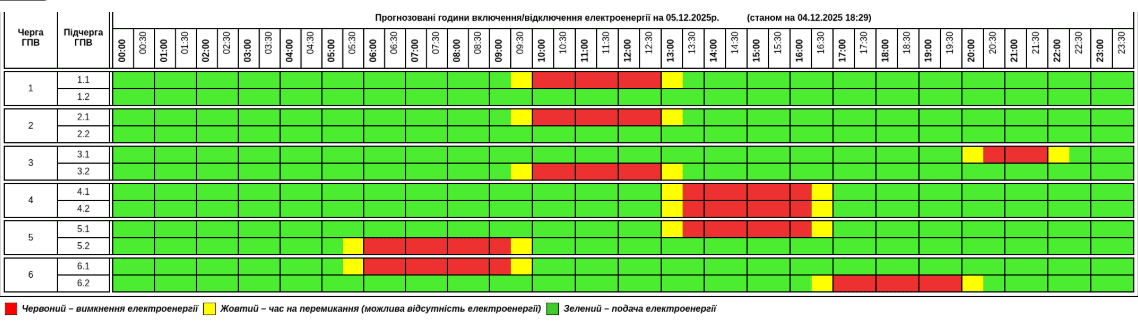 В усіх регіонах Україні у п’ятницю, 5 грудня діятимуть графіки погодинних відключень світла. Причина відключень — наслідки російських атак на українську енергосистему.