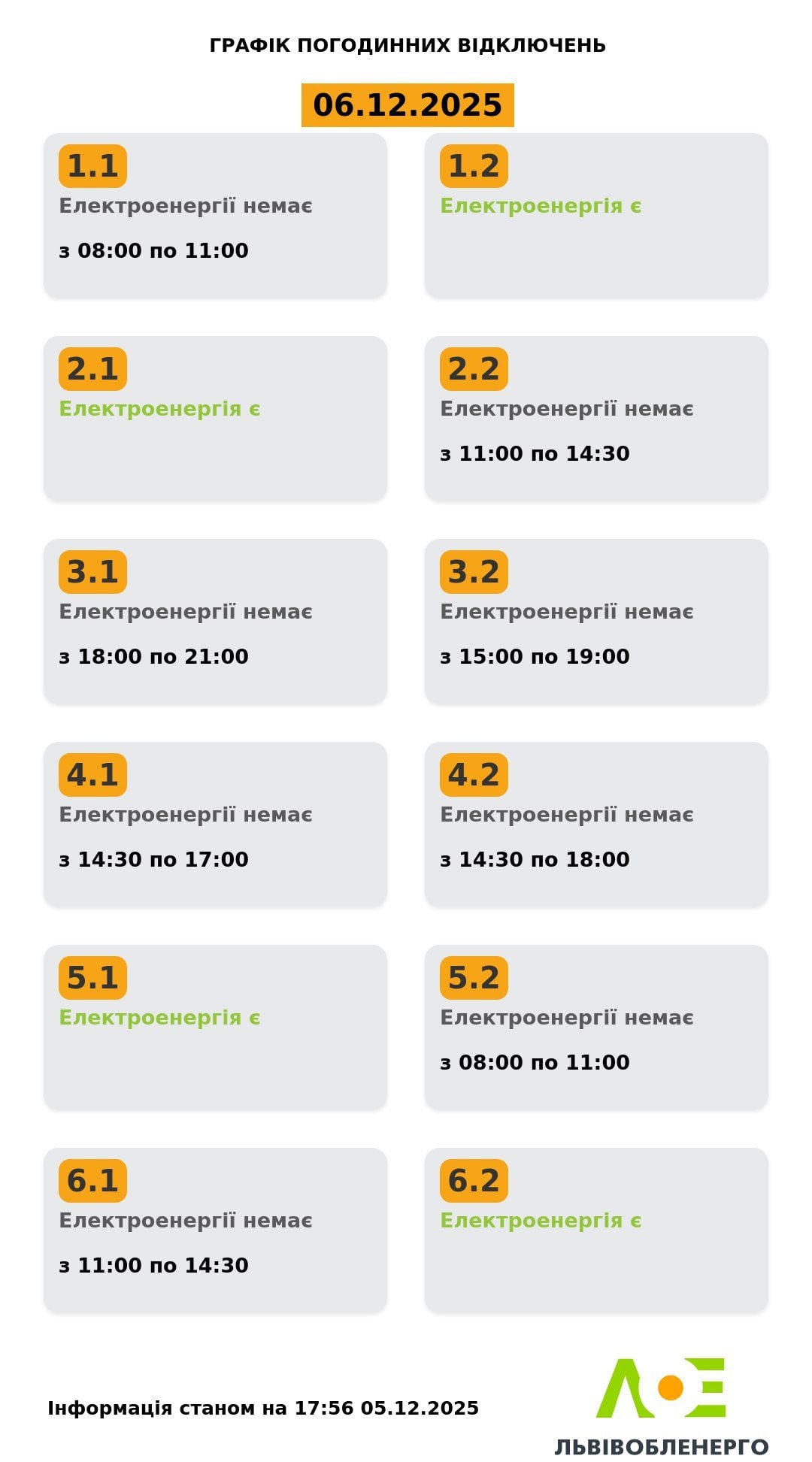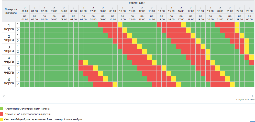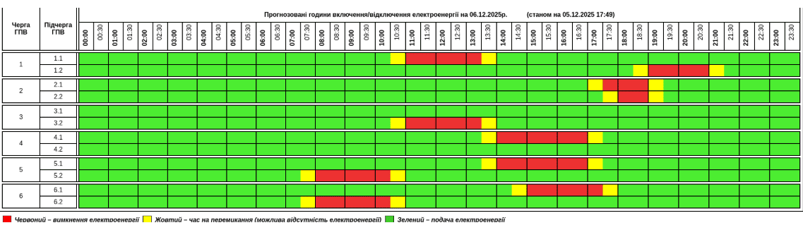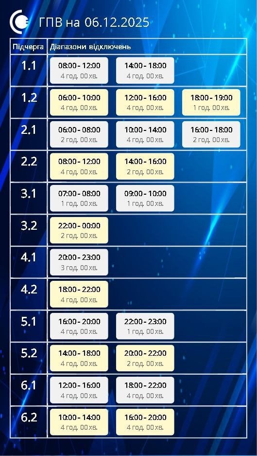 В усіх регіонах Україні у суботу, 6 грудня діятимуть графіки погодинних відключень світла. Причина запровадження обмежень — наслідки попередніх російських масованих ракетно-дронових атак на енергооб’єкти.
