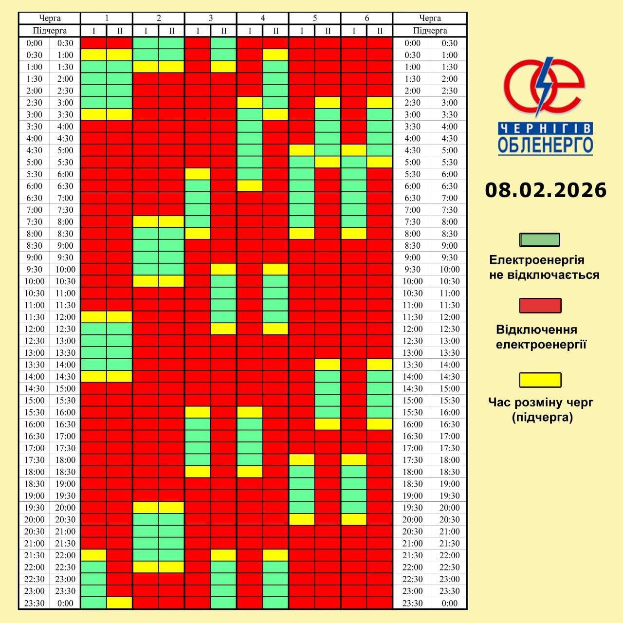 На Чернігівщині 8 лютого електрика в домівках буде лише по 4-6 годин на добу. Періоди зі світлом триватимуть лише по 2 години поспіль.