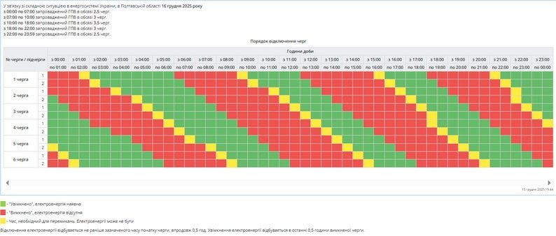 У зв’язку з виникненням дефіциту потужності в ОЕС України внаслідок обстрілів російською федерацією об’єктів енергетичної інфраструктури України, у Полтавській області будуть застосовані графіки обмеження споживання електричної потужності (ГОП) з 0:00 до 23:59 16 грудня 2025 року в обсязі 5 черг: