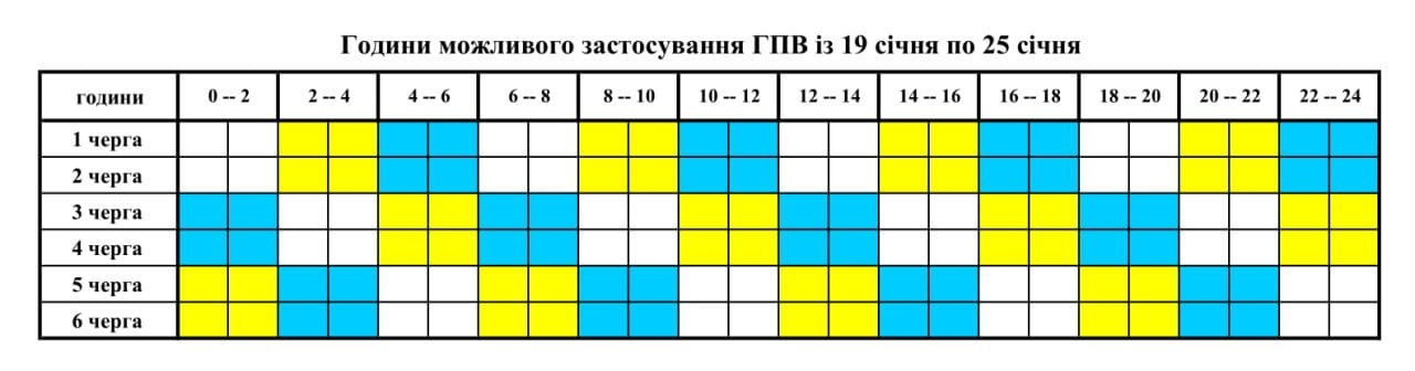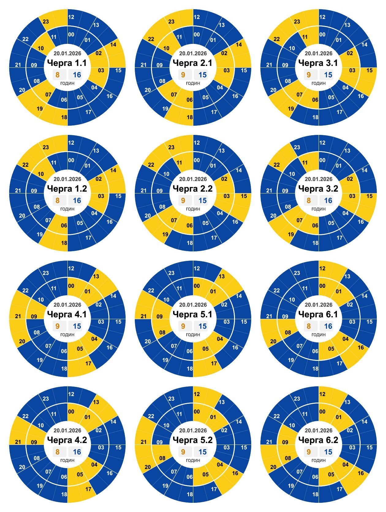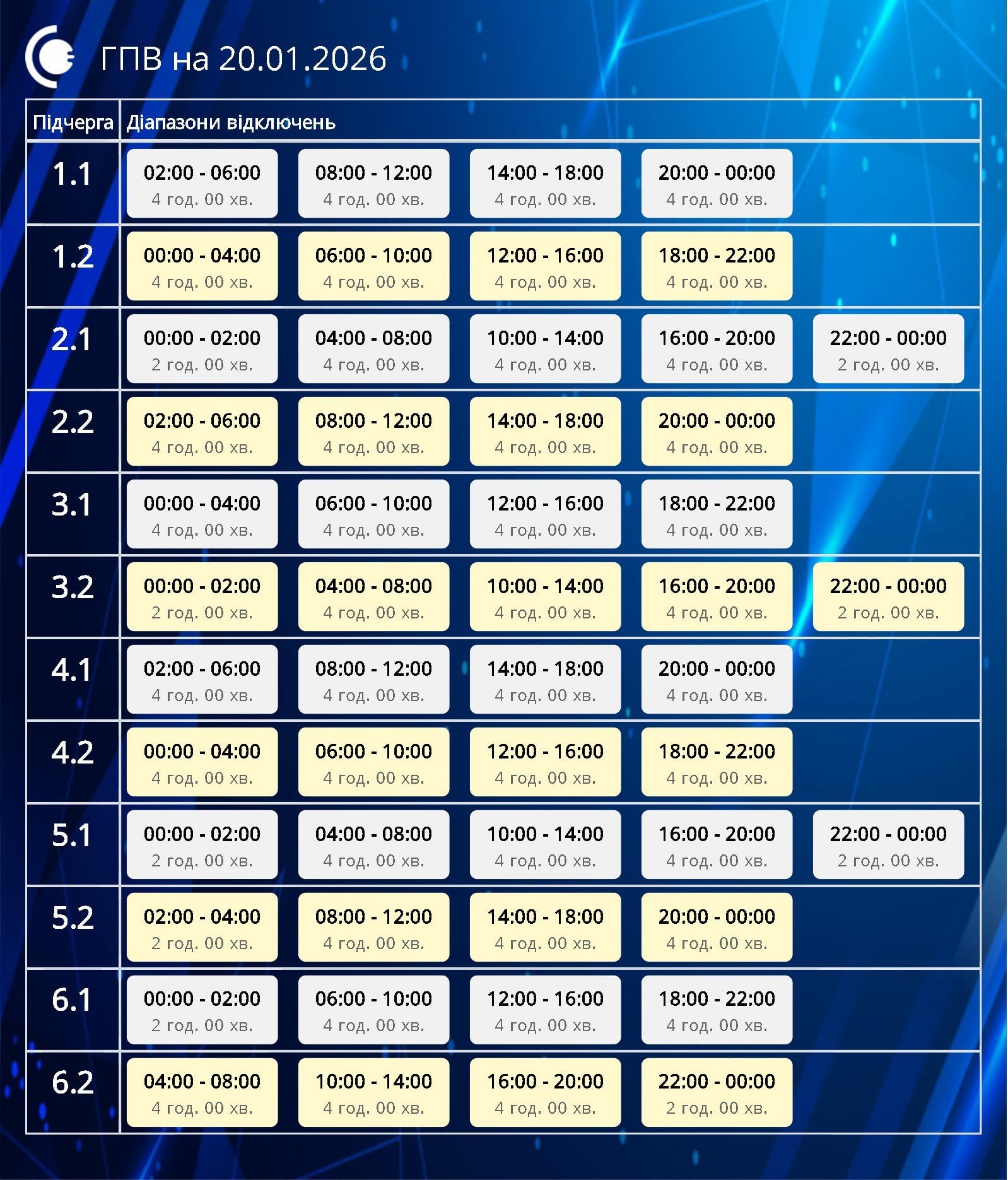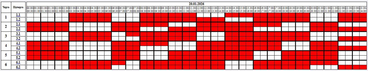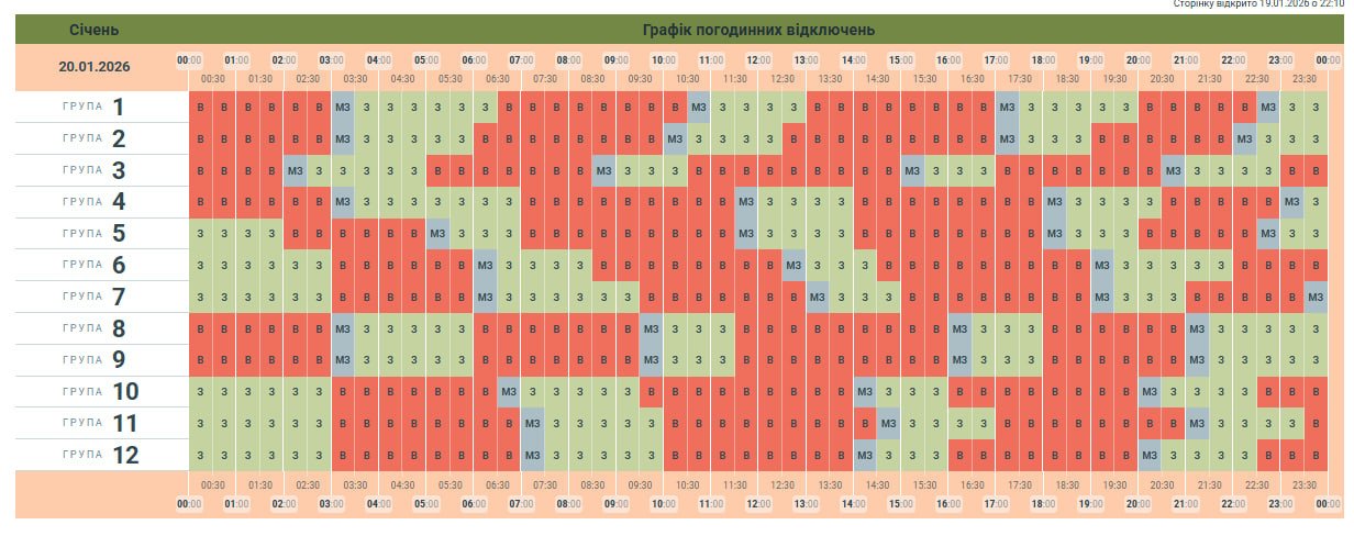 За розпорядженням НЕК «Укренерго» 20.01.2026 буде діяти наступний графік погодинних відключень (ГПВ):