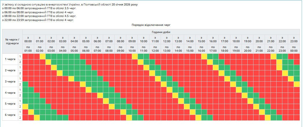 У зв’язку зі складною ситуацією в енергосистемі України, в Полтавській області 20 січня 2026 року: