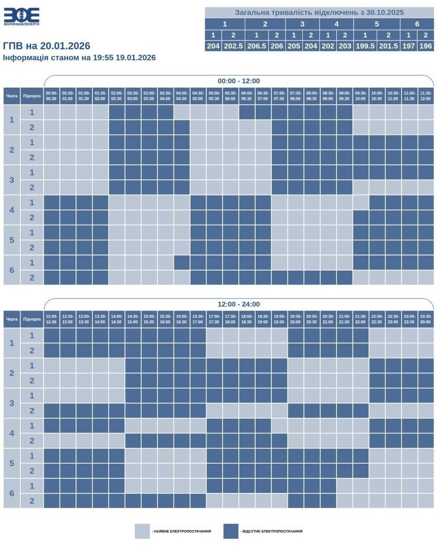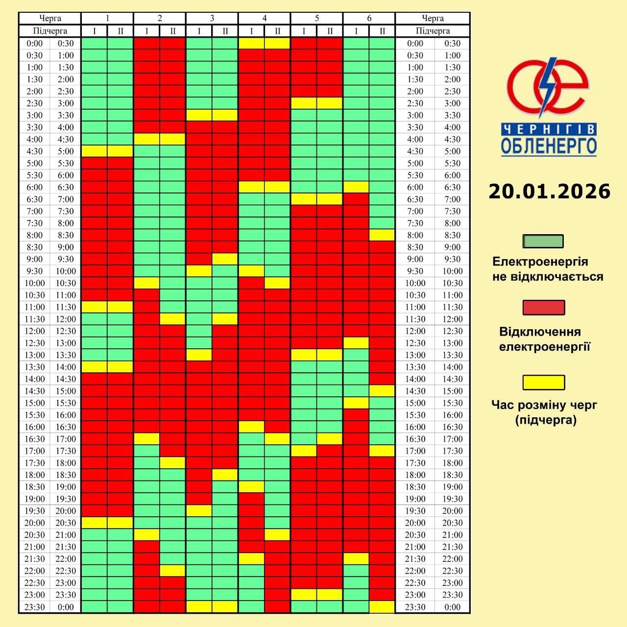 Графік погодинних включень/відключень електроенергії на 20.01.2026: