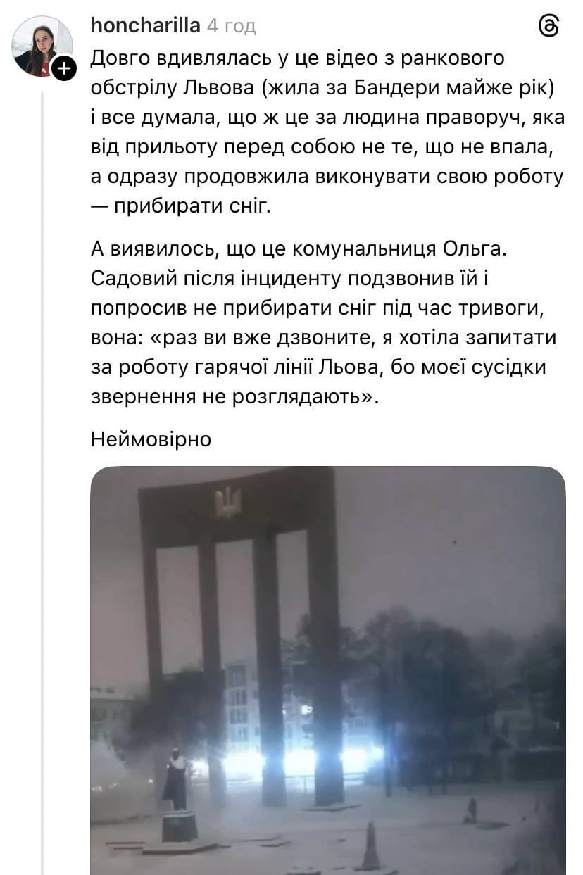 В епіцентрі подій опинилася працівниця комунальної служби — пані Оля. В той момент вона чистила сніг. Цікаво те, що після потужного вибуху та спалаху жінка лише на мить завмерла, а потім попри небезпеку продовжила працювати.