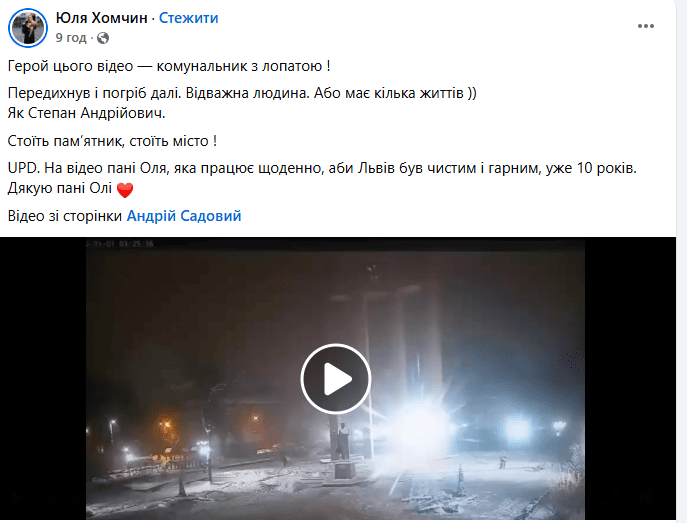 Водночас нардепка Мар’яна Безугла, коментуючи відео, нагадала історію двірнички з Бахмута, котра щодня підмітала подвір’я місцевої лікарні попри те, що місто було вже непридатне для життя.
