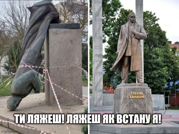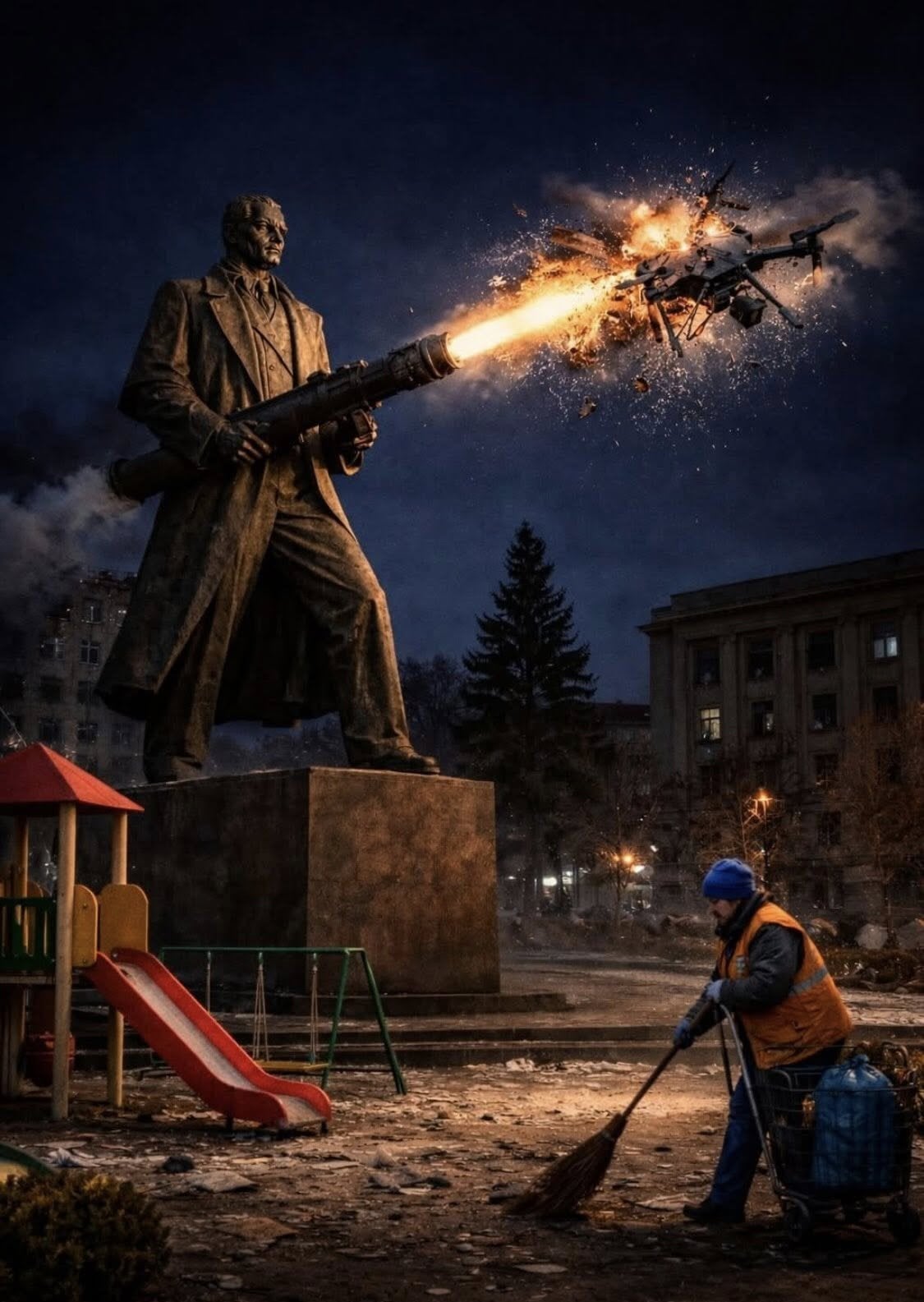 Користувачі створили картинки, на яких видно пам’ятник Степанові Бандері та як він відбиває ворожу атаку, а поруч двірничка прибирає уламки.
