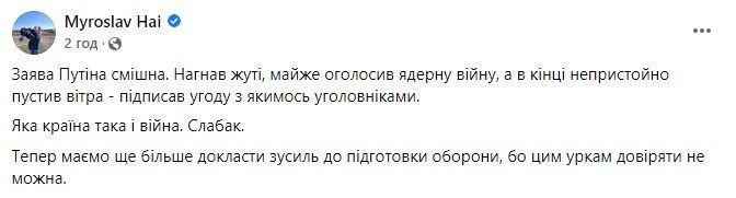 Заява Путіна смішна. Нагнав жуті, майже оголосив ядерну війну