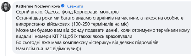 «Не приховую, такі спроби вже були, але багато солдатів, які використовують волонтерські „Старлінки“ та особисті „Старлінки“, не хотіли подавати інформацію командуванню. Раптом командир забере, або новий не дасть, або ще щось. Ми обов’язково придумаємо спосіб, як зібрати інформацію по Армії, так щоб солдати довірили нам цю інформацію. Хочу також сказати, що компанія SpaceX залучена до процесу і допомагає фахівцям Міністерства оборони. Я ще раз прошу вибачення у тих, кого тимчасово торкнулися вжиті заходи, але для безпеки країни зараз це дуже важливі і необхідні дії», — зазначив Бескрестнов.