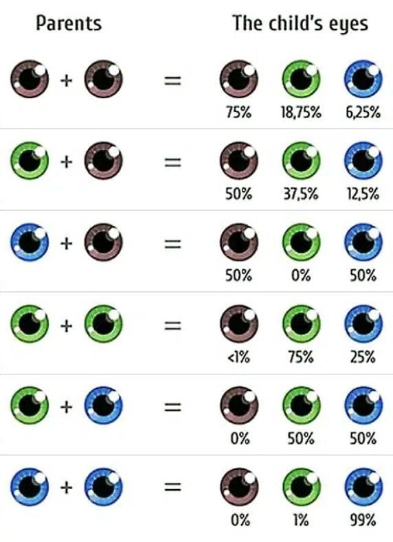 Якщо обидва батьки мають карі очі – у 75% випадках ймовірність, що у них з'являється кароокий малюк. Імовірність того, що відтінок буде зеленим 19%, та й світлі очі бувають всього у 6% малюків.