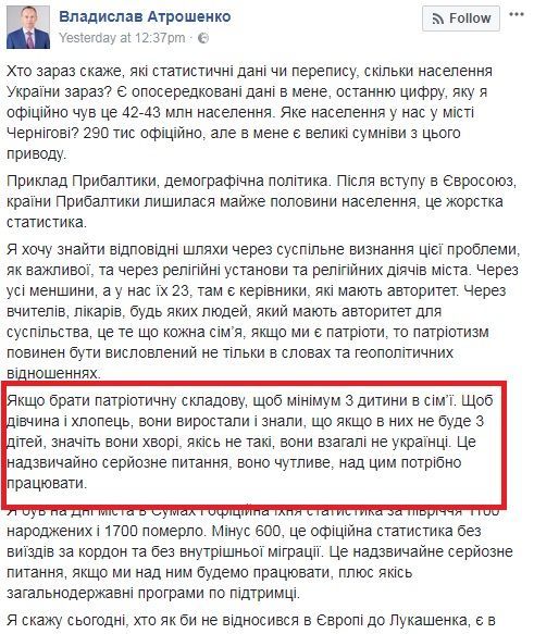 "Якщо брати патріотичну складову, щоб мінімум 3 дитини в сім'ї. Щоб дівчина і хлопець, вони виростали і знали, що якщо в них не буде 3 дітей, значить, вони хворі, якісь не такі, вони взагалі не українці. Це надзвичайно серйозне питання, воно чутливе, над цим потрібно працювати", - написав він.