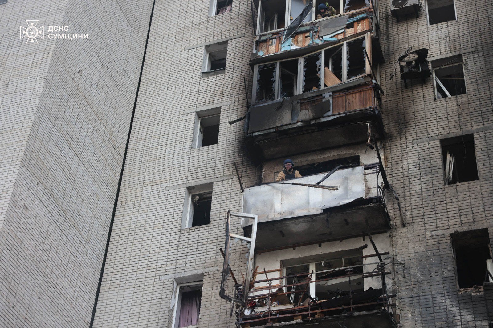 У місті Охтирка три дрони влучили в девʼятиповерхівку. Постраждало семеро людей.