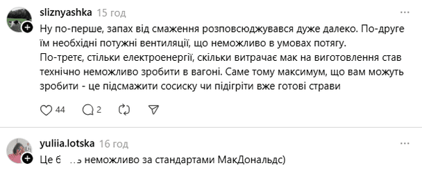 У соцмережі Threads запропонували встановити заклади швидкого харчування МсDonald’s у поїздах Укрзалізниці.