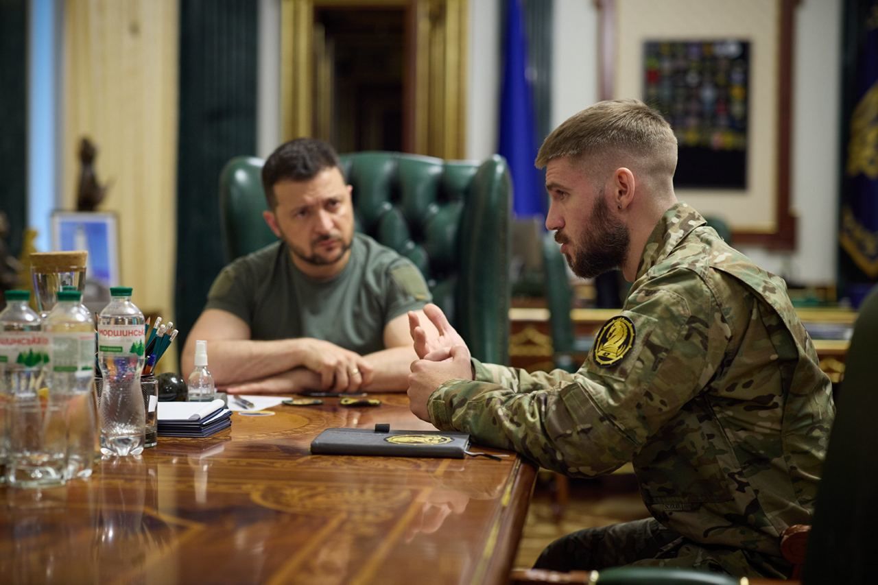 Президент України Володимир Зеленський зустрівся зі головним сержантом 47-ї окремої механізованої бригади "Маґура" Валерієм Маркусом.