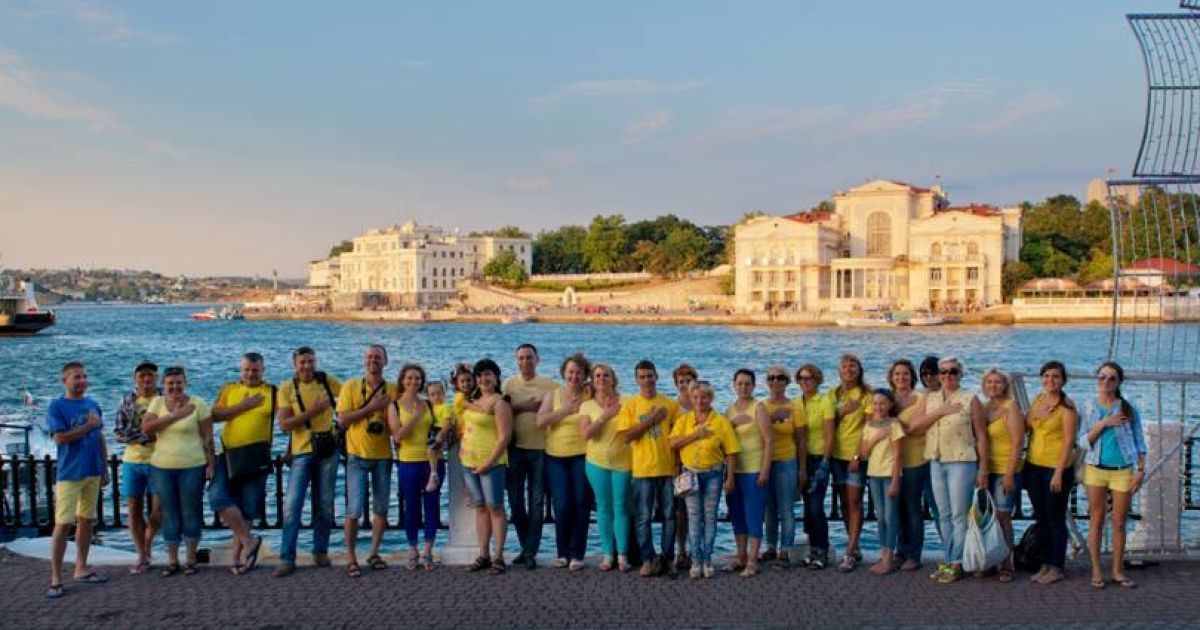 Жителі Севастополя, який як і Крим перебуває під анексією Росії, привітали Україну з Днем прапора та Днем Незалежності патріотичним флешмобом. 27 чоловіків, жінок та дітей прийшли на набережну Чорного моря в синьому та жовтому одязі, як кольори українського прапора.