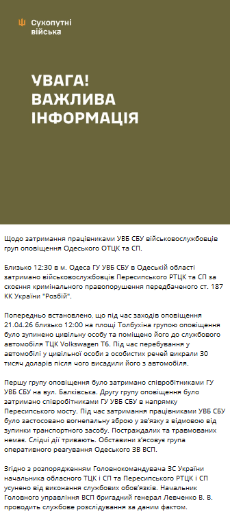 Зазначається, що начальника Одеського обласного ТЦК та Пересипського районного ТЦК усунено від виконання службових обовʼязків. Начальник Головного управління ВСП генерал Левченко проводить службове розслідування.