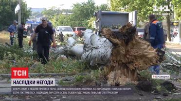 Повалені дерева. 150 гектарів лісу зруйнував смерч, який пронісся через селище Велика Олександрівка, Херсонська область. Місцевий житель опублікував вражаюче відео, де старі сосни стоять поламані як сірники, а інші - вирвані з корінням. У неділю смерч пройшов смугою через селище і ліс, ламаючи все на своєму шляху. Пошкодив 300 осель, газову підстанцію і повалив електроопори. Майже тисяча домівок залишилися без електрики і газу. За приблизними підрахунками сума збитків у селищі складає понад 6 мільйонів гривень.