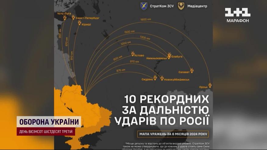 1800 кілометрів від українського кордону - це рекордна відстань, куди прилітало на території Росії за шість місяців цього року. Управління стратегічних комунікацій Генштабу ЗСУ опублікувало мапу ТОП 10 ударів по ворожій території, куди дістали найдалі. Найдалі розташовані містечка Орськ, Салават і Єлабуга. У Генштабі кажуть - ці удари відбуваються за допомогою зброї українського виробництва. Деталі – в ТСН.