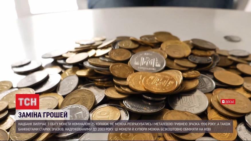 Нацбанк вилучає з обігу монети номіналом 25 копійок. Не можна вже розрахуватися і металевою гривнею зразка 1996 року, а також паперовими банкнотами, надрукованими до 2003 року. Пересічним українцям старі гроші викидати не треба. Монети й купюри вказаного номіналу можна безкоштовно обміняти ще протягом трьох років.